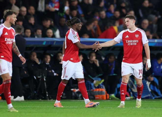 阿森纳近段时间在英超的表现不佳,被曼城连连追分,虽然还是领头羊,但领先优势只剩下2分。作为本赛季欧冠目前为止唯一全胜的球队,来到欧冠赛场,阿森纳又找回了状态。今天作客扬布雷德尔球场,开场后阿森纳就反客为主展开猛烈攻势,第3分钟,阿森纳右路压上转移中路,厄德高禁区弧顶前接球稍作调整左脚大力兜射,门将休维尔奋力将球扑出。第20分钟,阿森纳右路进攻,厄德高下底传中,马杜埃凯小禁区线上抢点后脑勺一蹭将球顶回来,斯凯利禁区弧顶处迎球左脚凌空扫射,这球打偏了,不过刚好踢到因卡皮耶跟前,后者小禁区前沿半转身凌空一挡,BOOM的一声,皮球被门柱挡出,布鲁日逃过一劫。